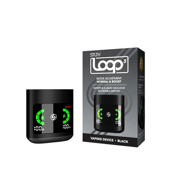 STLTH LOOP 3 muestra en su pantalla LED el nivel de e-líquido y el porcentaje de batería. Permite ajustar el flujo de aire para un puff cerrado o abierto. Incluye 2 modos de vapeo.